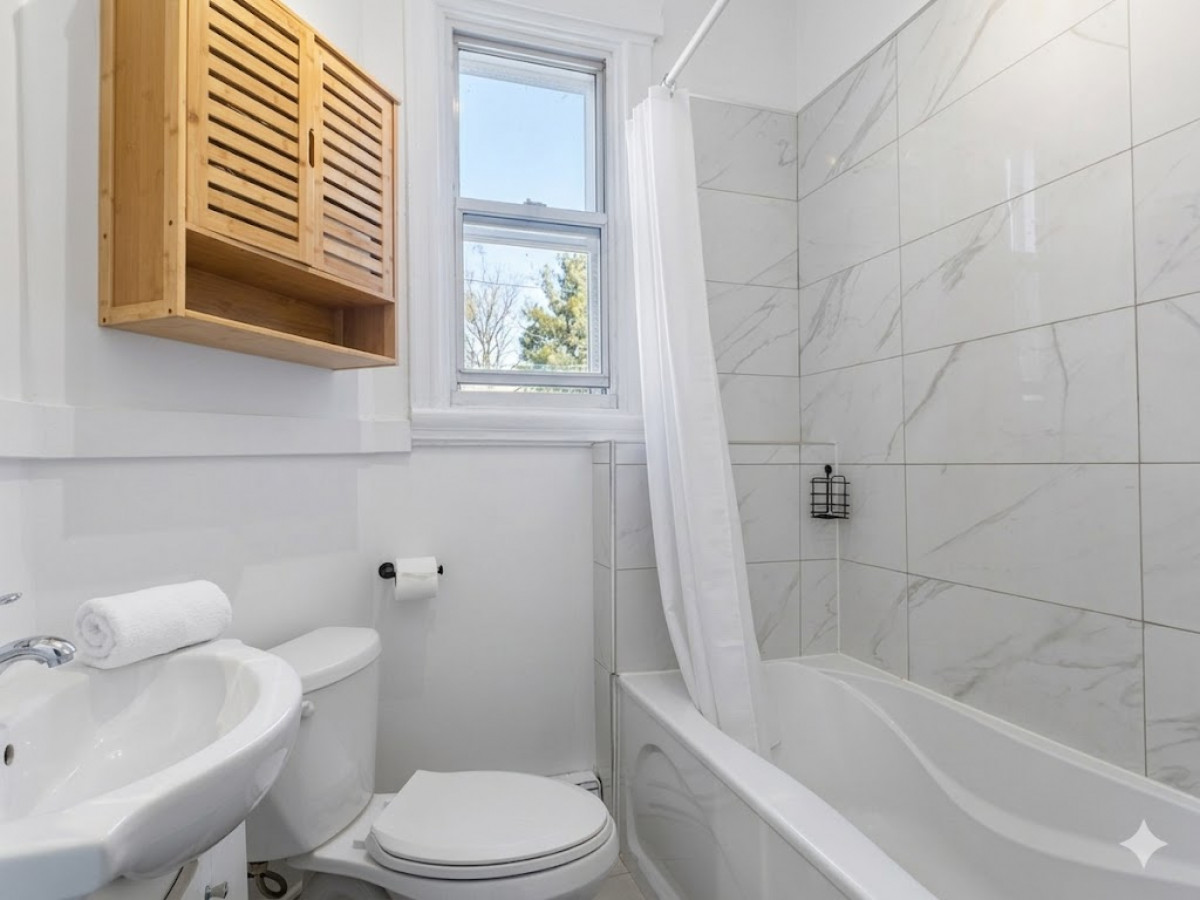 On the 2nd floor: Master bedroom with enough room for a king bed. Office space and access to a balcony. 2nd good size bedroom with office space. Renovated bathroom with double vanity, clawfoot tub and separate shower. Access to a private terrace with no facing walls.